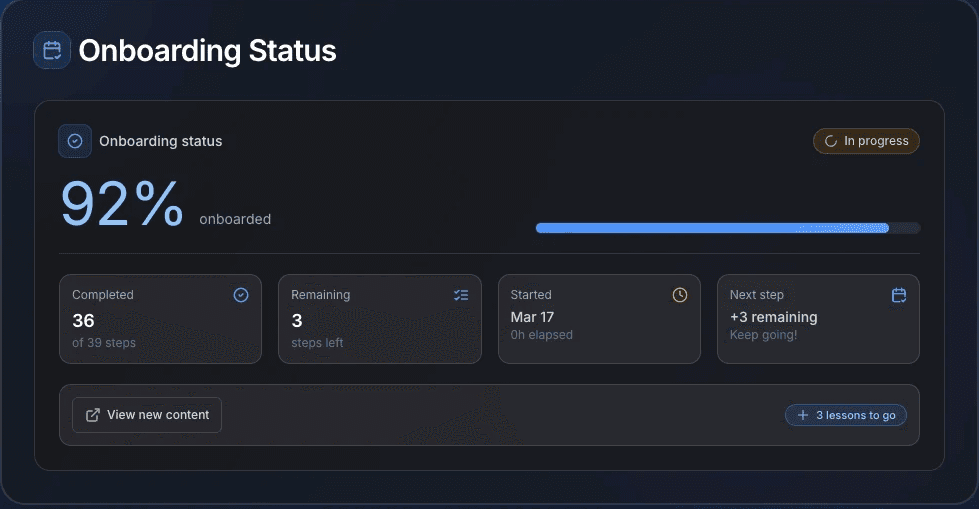 The onboarding team focuses on what matters. Instead of repeating the same basic walkthroughs for every new customer, the team now spends their time on the complex, high-value onboarding work that actually requires human expertise.